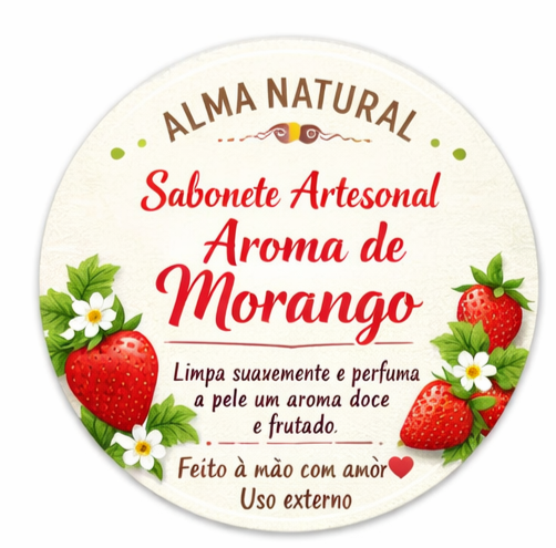 Sabonete artesanal feito à mão com aroma doce e frutado de morango.