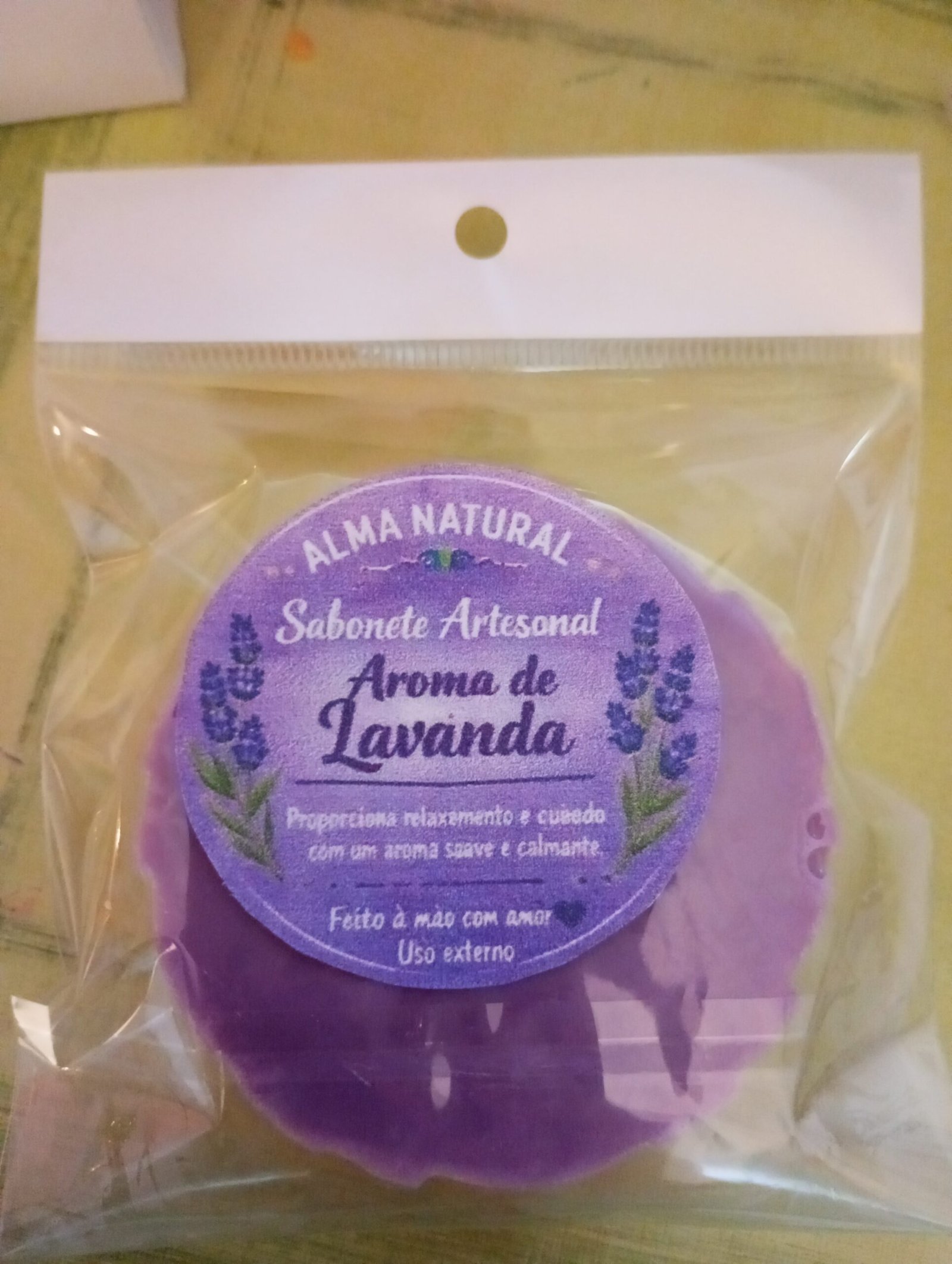 Sabonete artesanal feito à mão, com aroma suave de lavanda, ideal para limpar a pele de forma delicada e natural.